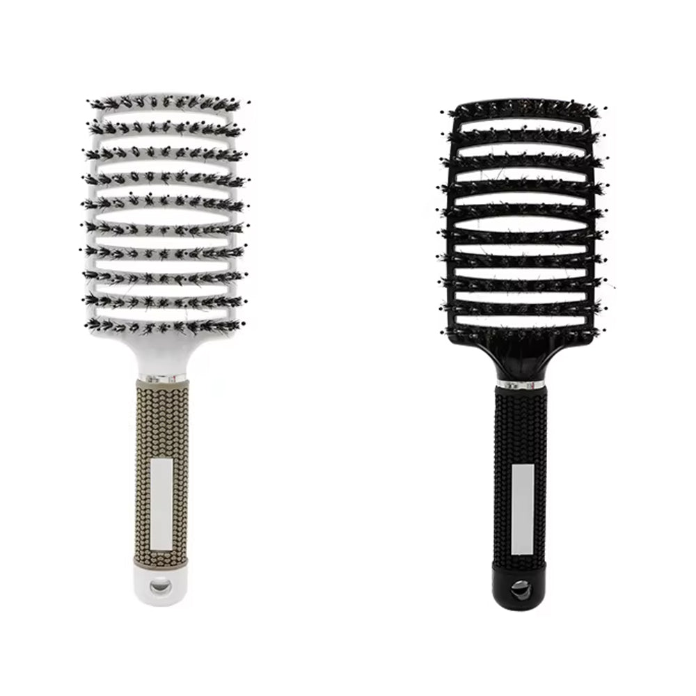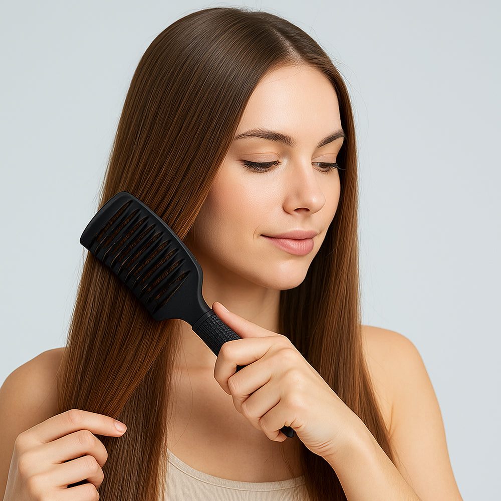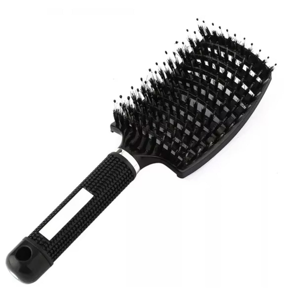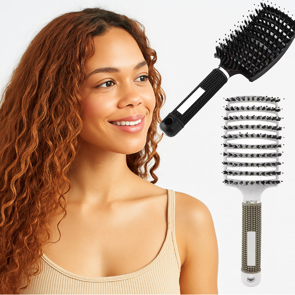 Det ergonomiske gummihåndtaket med anti-skli grep gjør børsten behagelig å holde i, selv ved lengre bruk. Den lette konstruksjonen og det buede designet følger naturlig hodeformen og gjør hårpleien enkel og komfortabel.