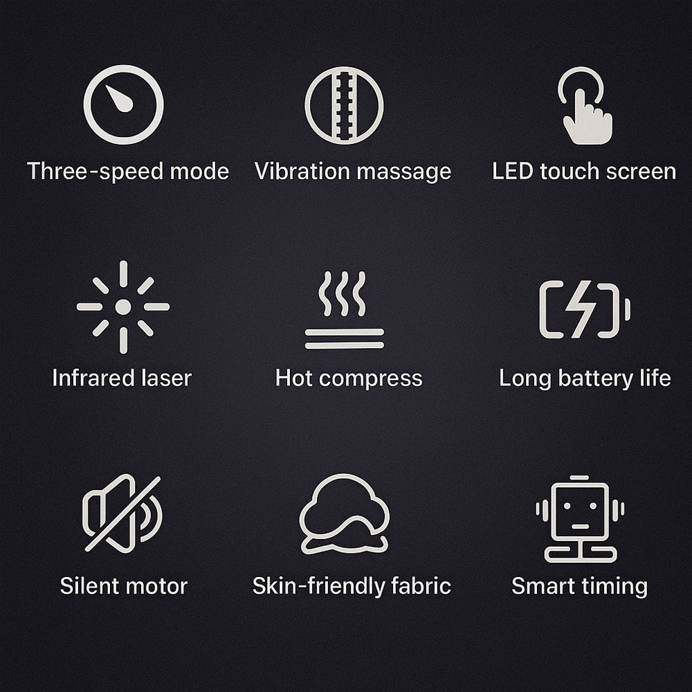 Hvis du lider av kroniske eller akutte smerter fra skader i albuer, knær eller skuldre, overbelastning, leddgikt, væskeansamling eller annet, så kan vårt knemassasjeapparat med vibrasjonsmassasje absolutt hjelpe deg. Apparatets infrarøde lysterapi hjelper deg med å redusere ømhet og smerter. Knemassasjeapparatet har en stor LED-berøringsskjerm som er enkel og grei å betjene. Apparatet har 4 funksjonsinnstillinger, som automatisk slår seg av etter 10 minutter, 3 temperaturnivåer og 3 intensitetsnivåer.