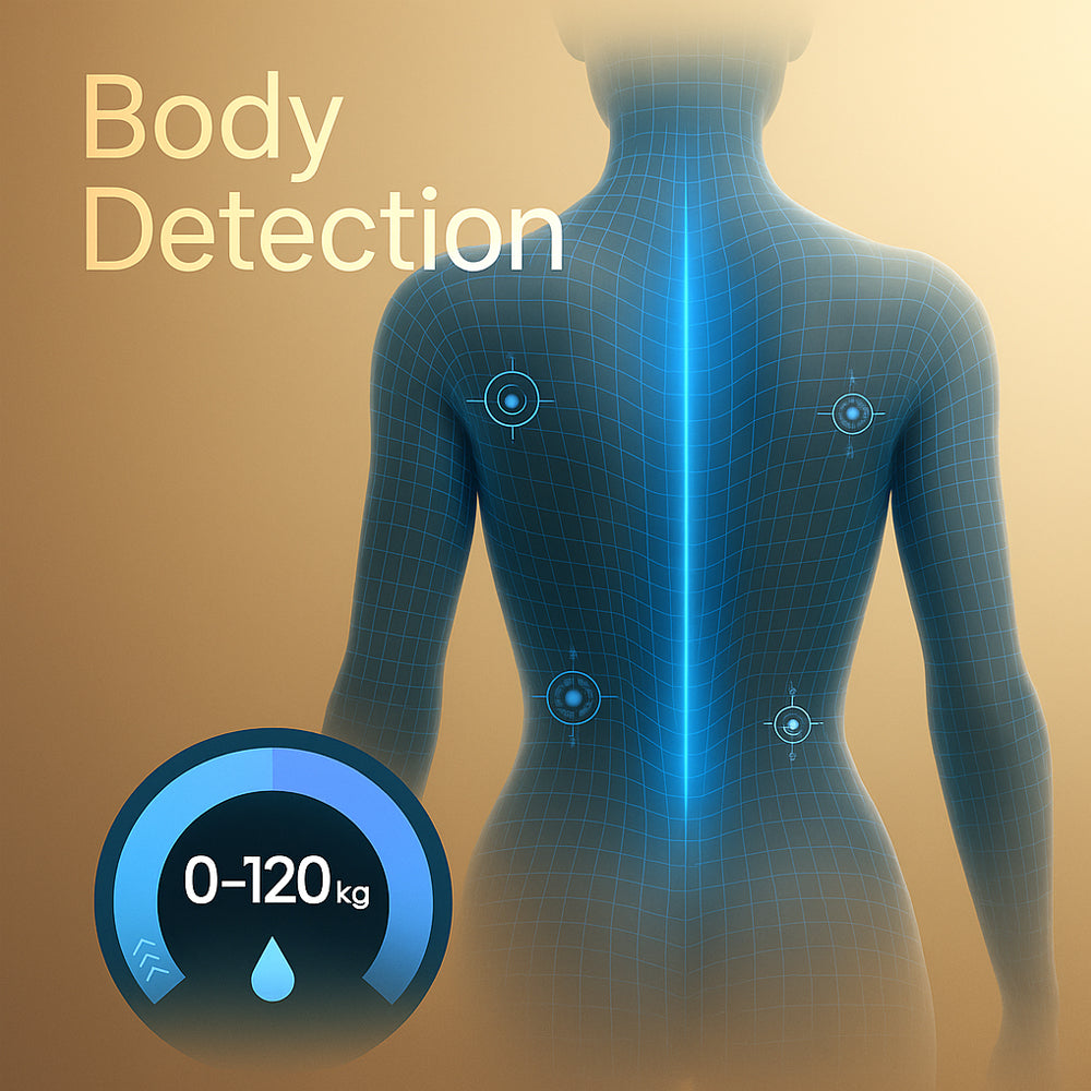 LCD-berøringsskjerm: Stor, intuitiv skjerm med 18 programmer, valg av massasjetid 5–30 min, intensitet og soner.