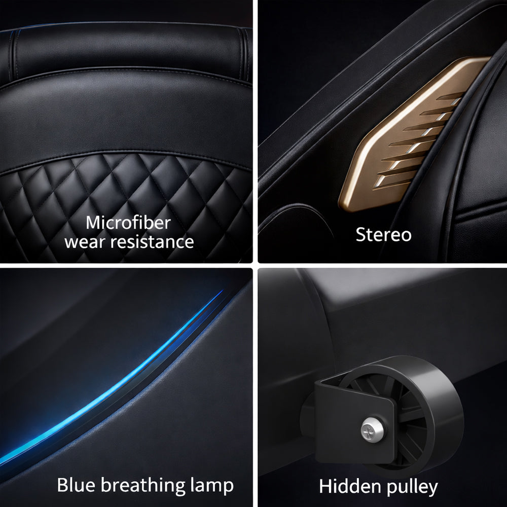 Elegant design i premium PU-skinn med quiltet ryggseksjon, integrert LED-lys (“blue breathing lamp”) og skjulte transporthjul.