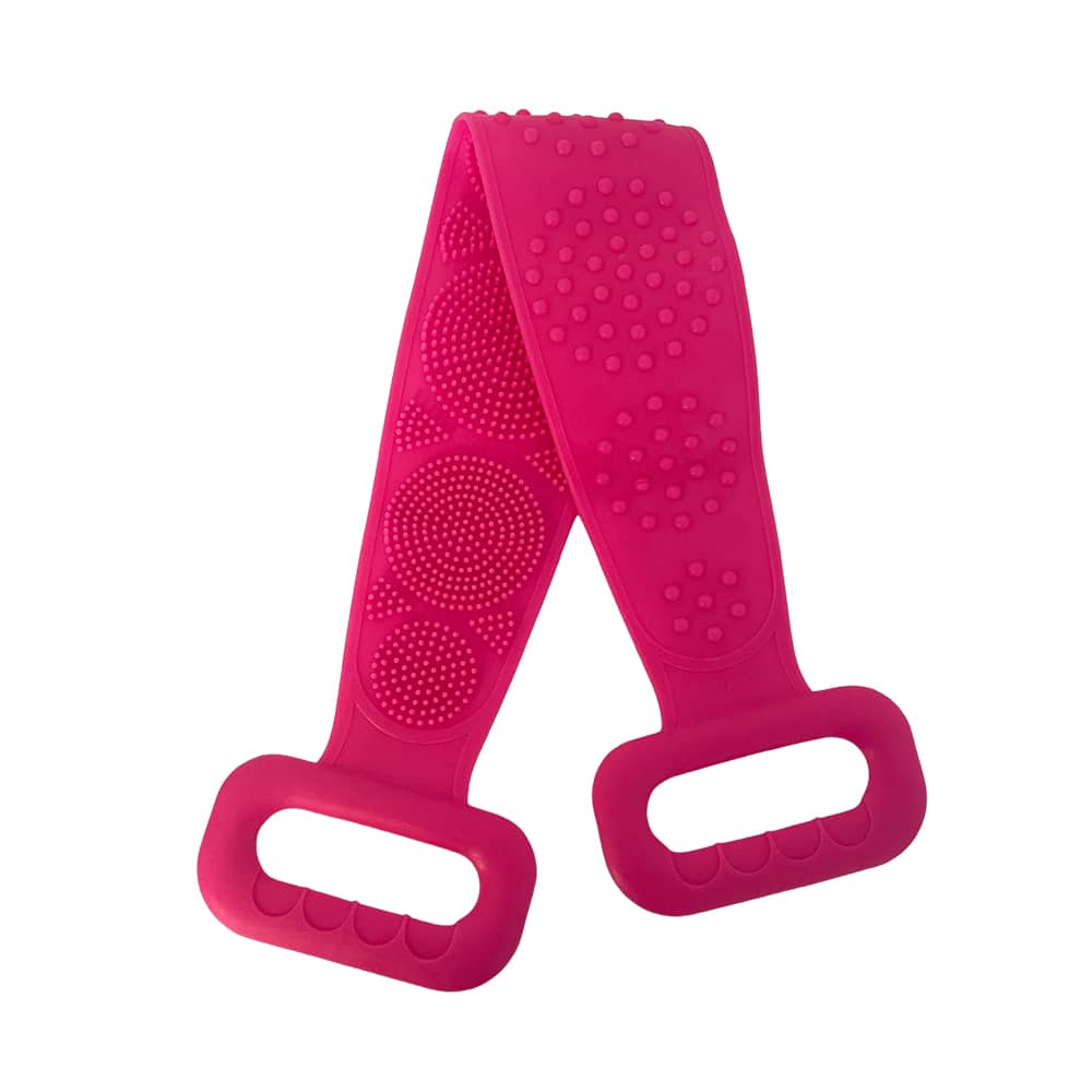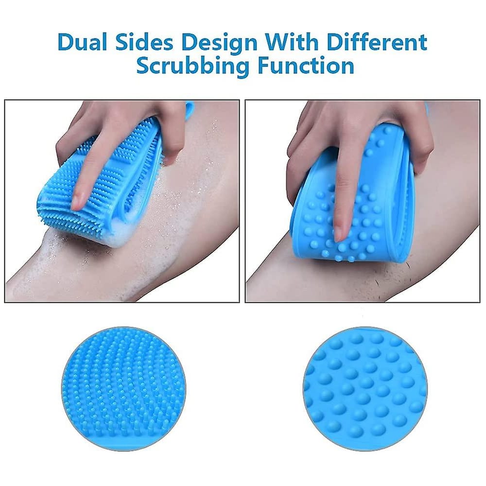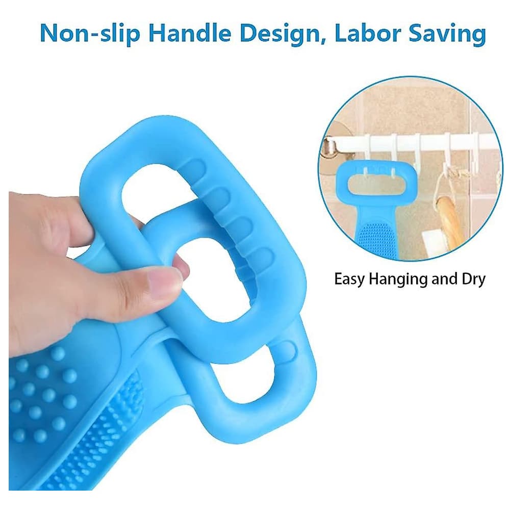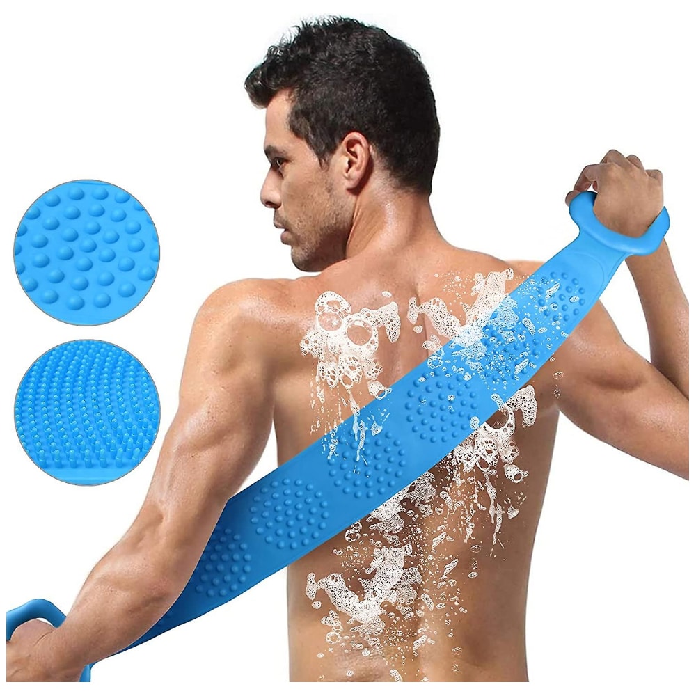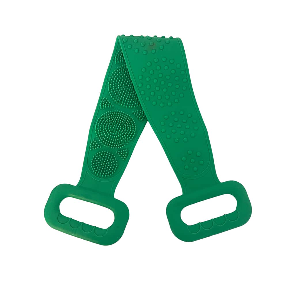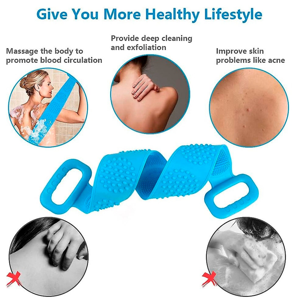 Den ene siden skrubber, den andre siden masserer. Ryggskrubberen er ca. 70 cm lang slik at du kan nå hele ryggen. Du finner et håndtak i hver ende av ryggskrubberen, noe som gjør det enkelt å få et godt grep.