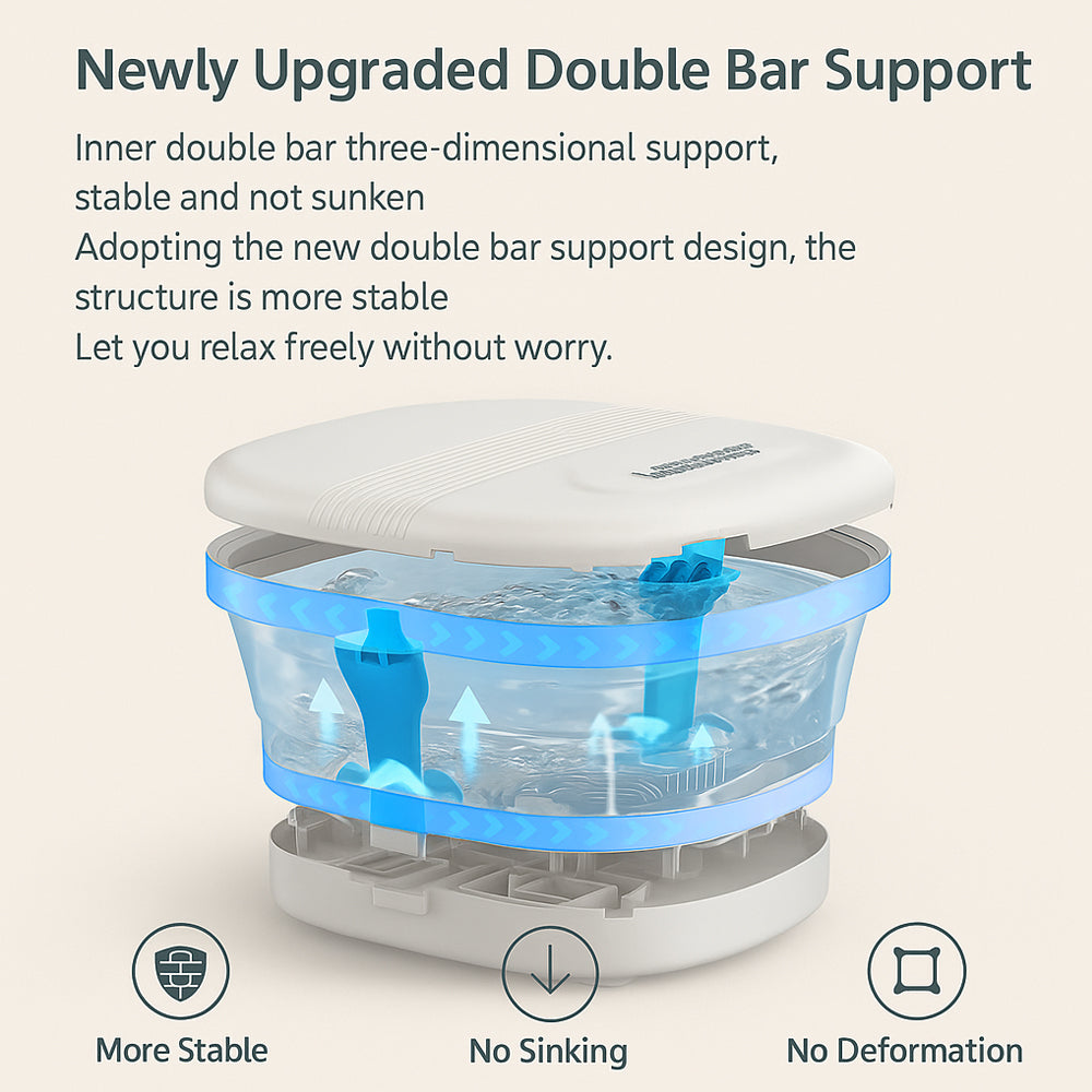 Den nyeste designoppgraderingen byr på forsterket parallel-bar støtte, som sikrer at karet står stabilt – selv når det er fylt med vann. Samtidig gjør det sammenleggbare designet det enkelt å oppbevare det under sofaen, i skapet eller i skuffen.