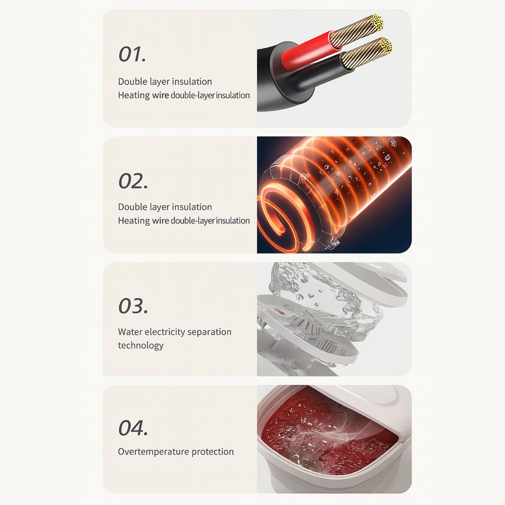 Med separasjon av vann og elektrisitet, dobbeltisolerte varmetråder og overopphetingsbeskyttelse kan du trygt nyte fotspaet ditt. Den avanserte konstruksjonen sikrer at strøm aldri kommer i nærheten av vannet, slik at du kan fokusere på ren avslapning.